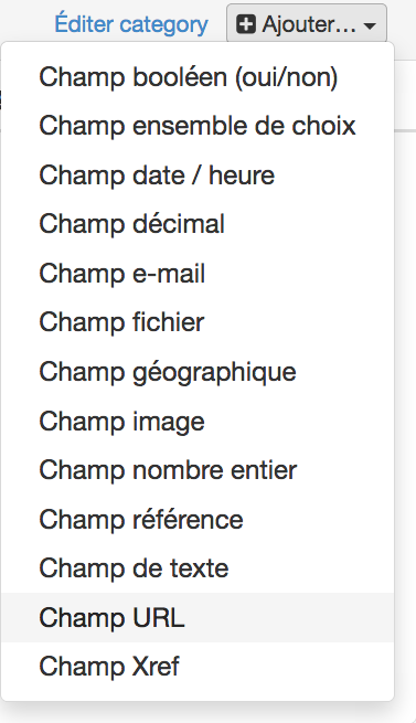 La procédure est similaire à celle de l’édition d’une fiche et débute par un clic sur la liste déroulante “+ Ajouter…” qui révèle les différents choix de champs possibles :