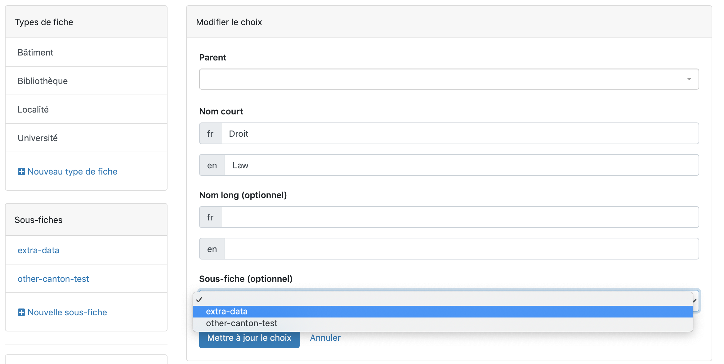 Lors de la création ou de la modification d’un ensemble de choix, il est possible de lier une sous-fiche en éditant un choix, puis en sélectionant la sous-fiche choisie sous “Sous-fiche (optionnel)”.