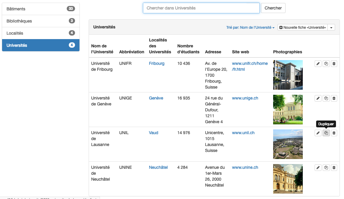 Pour choisir la fiche à dupliquer, sélectionner le type de fiche correspondant dans la barre latérale gauche. Les données existantes s’affichent sous forme d’un tableau. Pour dupliquer une fiche, cliquer sur le bouton “Dupliquer”