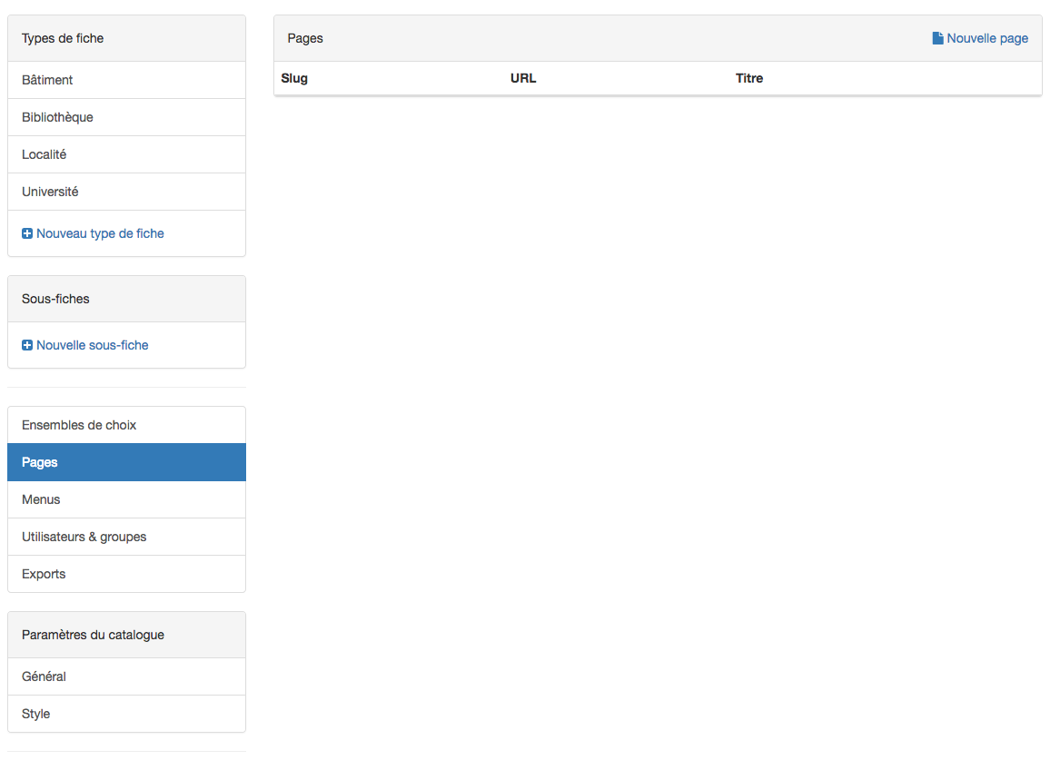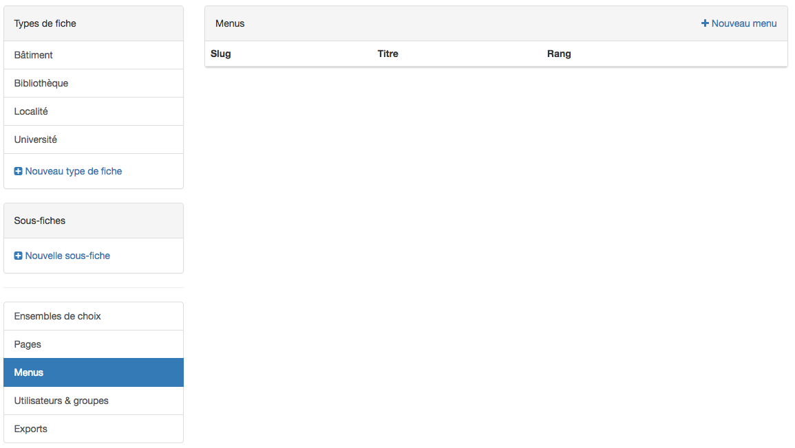 Cette rubrique permet d’organiser la présentation de la barre de menus, permettant de naviguer dans le site. Par défaut, les onglets permettent d’accéder aux différents types de fiches, classés par ordre alphabétique. Créer un nouveau menu permet de changer le nom des menus dans la barre horizontale supérieure, mais aussi de créer un accès facile à des pages personnalisées (voir la section “Pages personnalisées”)