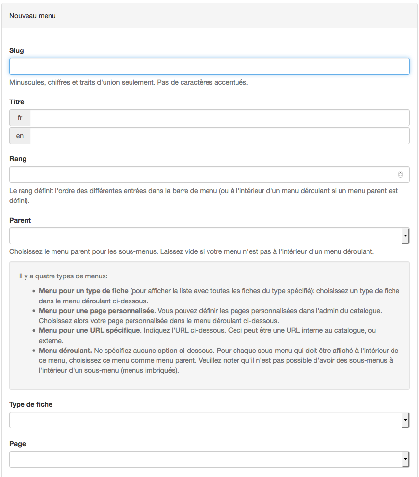 Les champs suivants dépendent ensuite du type de menu choisi :