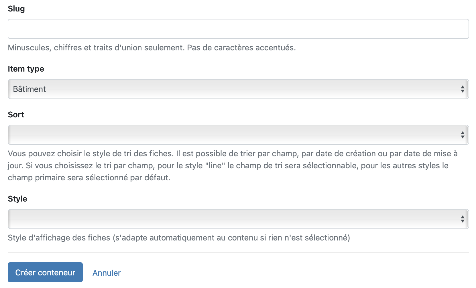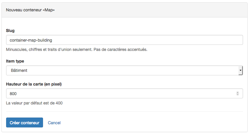 Choisir un “slug” (nom court à donner au conteneur). Celui-ci apparaitra dans l’adresse web (URL) du site généré par CATIMA. Il doit être unique et n’être composé que de lettres (non accentuées), nombres et de traits d’unions. Les slugs sont souvent en anglais.