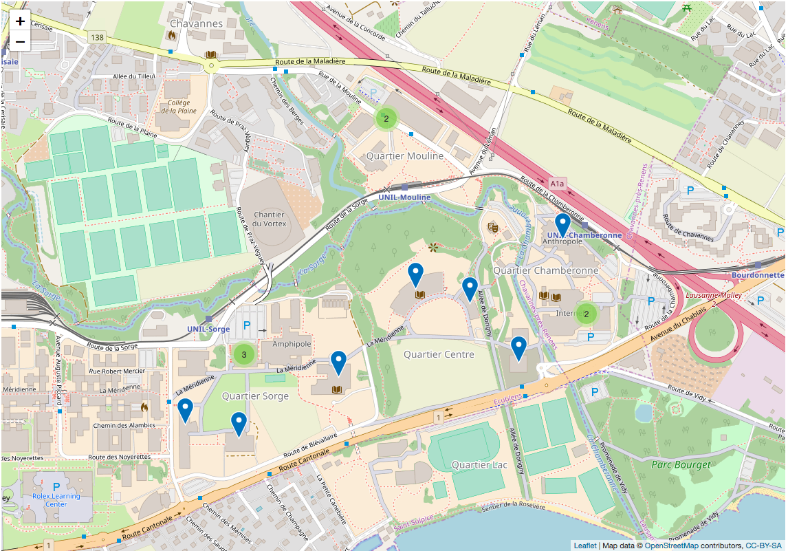 Ce type de conteneur permet de générer automatiquement une carte géographique affichant les données géographiques pour un type de fiches donné, comme ceci :