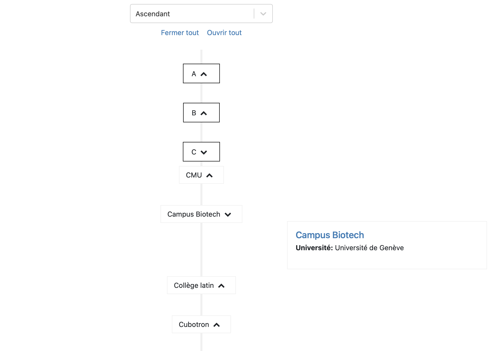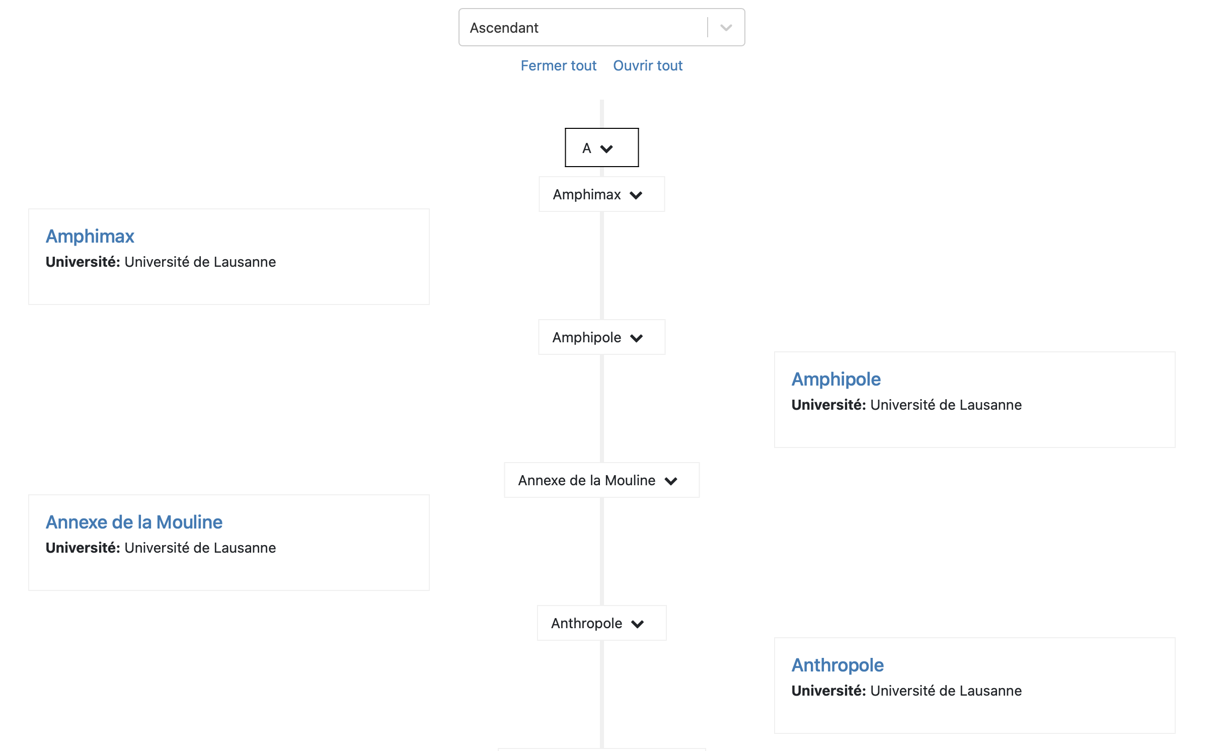 Le style line affiche les fiches le long d’une ligne verticale; il permet le tri par date ou ordre alphabétique. Le visiteur peut ouvrir ou fermer les fiches et les classer par ordre ascendant ou descendant. Dans l’image ci-dessous, on a choisi Tout fermer avant d’ouvrir une seule fiche.