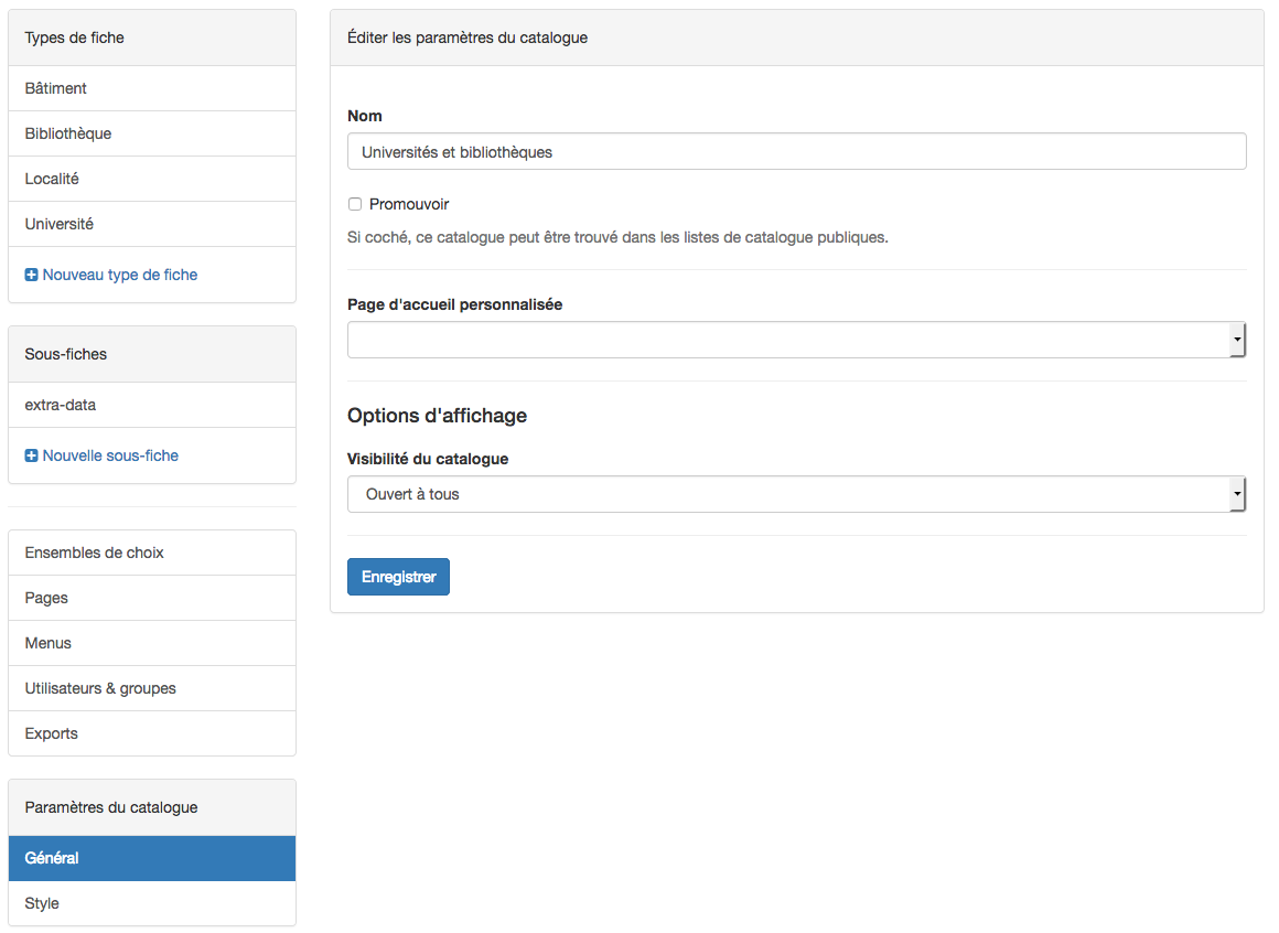Un catalogue permet de stocker des données (texte, images, dates, etc…) structurées sous la forme de types de fiches. Les types de fiches représentent des entités conceptuelles (p.ex le concept “livre”) possédant des caractéristiques définies (p.ex “auteur”, “année de publication”).
