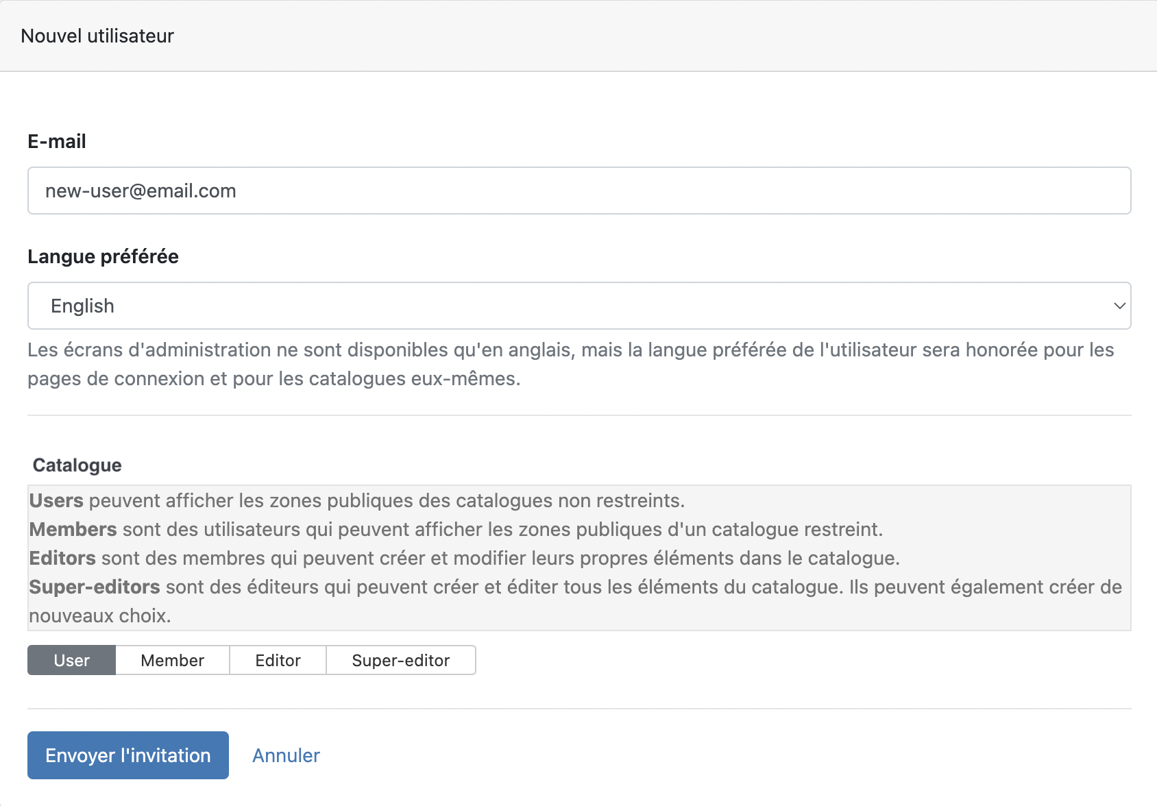 Il existe une FAQ consacrée à toutes les questions concernant l’imvitation d’utilisateur-ice-s sur un catalogue consultable ici.