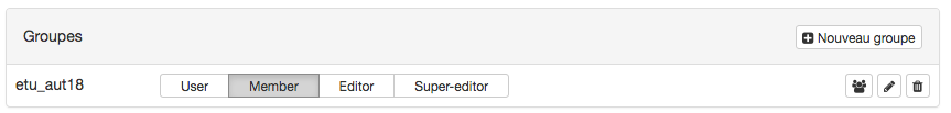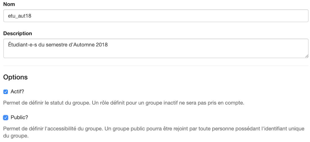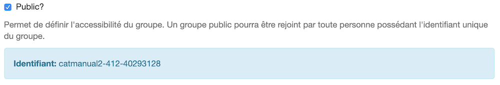 Lors de la création d’un groupe, vous avez la possibilité de cocher la case “Public?”, qui est spécialement utile si le but est d’ajouter beaucoup de personnes en même temps. Ceci générera un identifiant qu’il est possible de partager avec, par exemple, tous les étudiant-e-s du semestre d’Automne 2018, qui pourront ensuite rejoindre ce groupe.