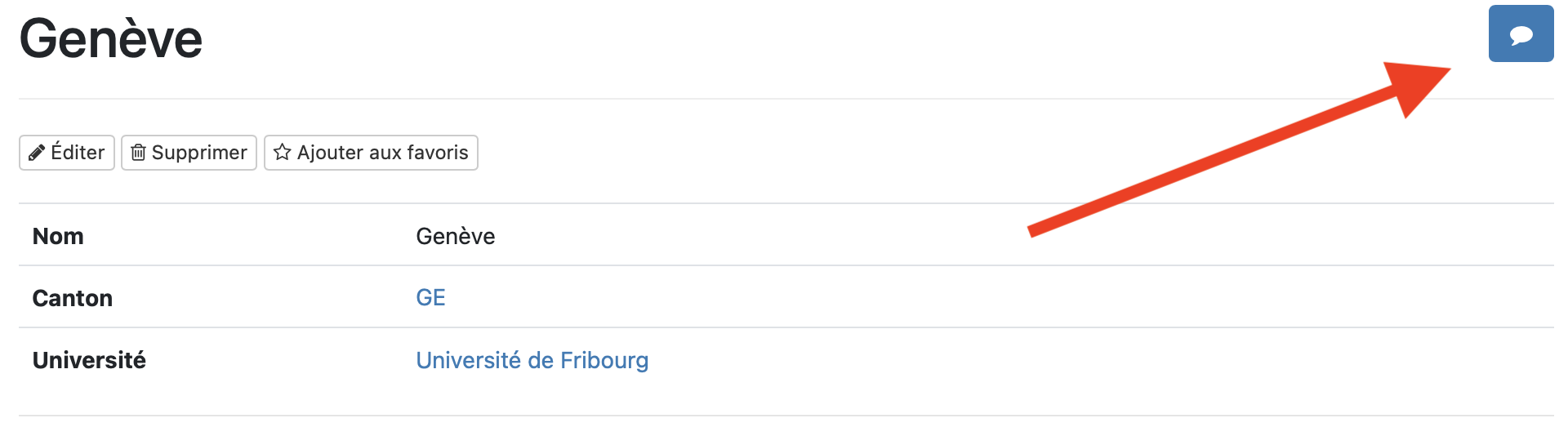Pour choisir la fiche à éditer, sélectionner le type de fiche correspondant dans la barre latérale gauche. Pour modifier la fiche souhaitée, cliquer sur le bouton “Éditer”