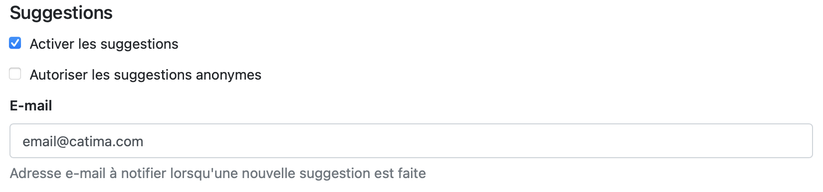 Pour activer cette option, sélectionner Activer les suggestions. Les utilisateurs ont besoin d’un compte Catima pour envoyer leurs suggestions. Afin que des visiteurs sans compte Catima puissent aussi envoyer leurs suggestions, activer Autoriser les suggestions anonymes.