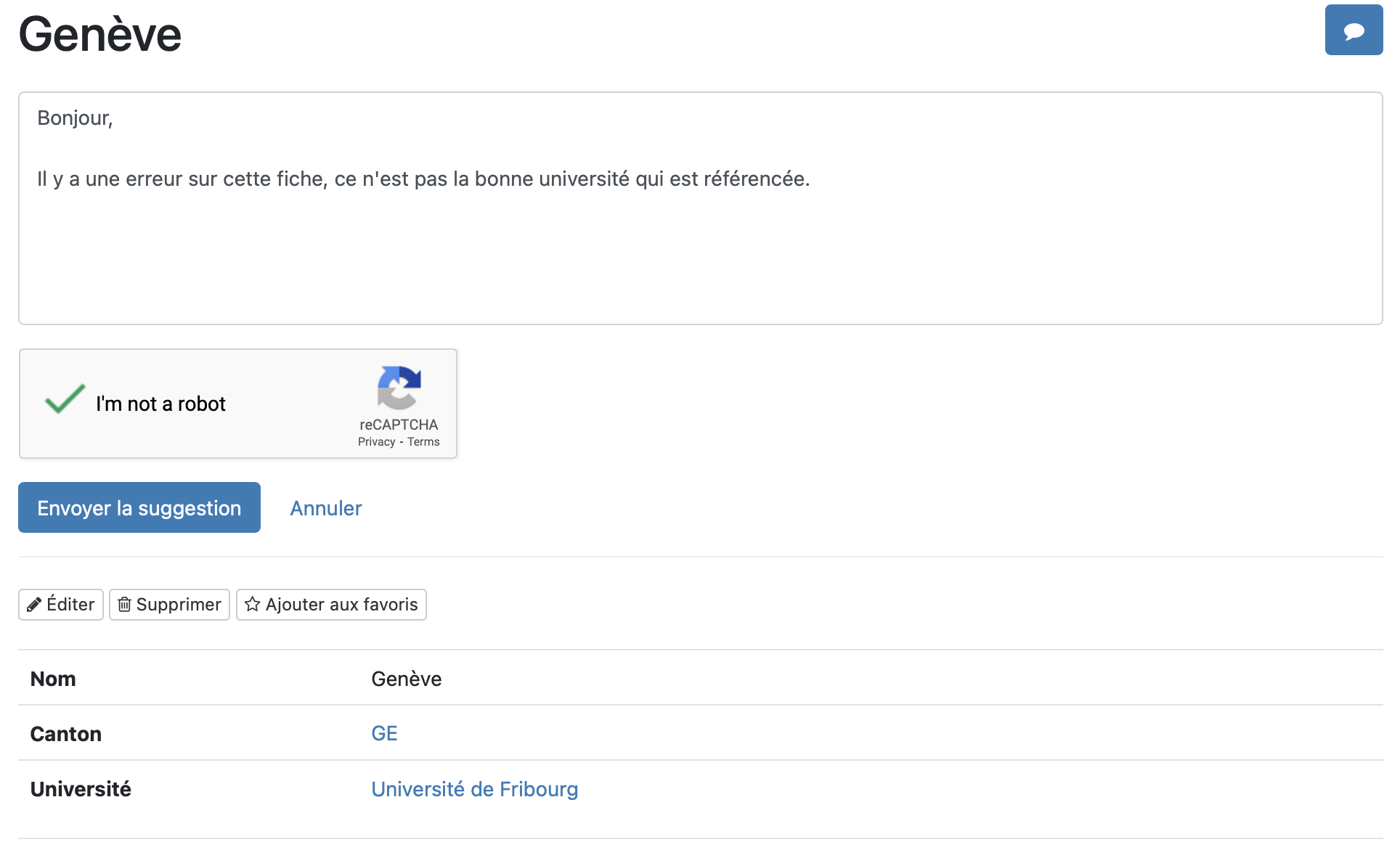 Une fois la suggestion faite, un email est de notification est envoyé à l’adresse spécifiée. Elle apparaît aussi en mode Data par une pastille à côté de la fiche en question